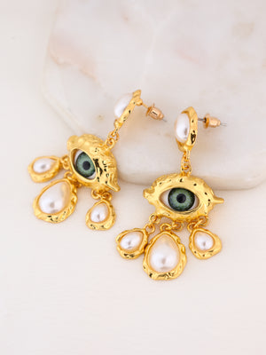 These gold-plated statement earrings feature a bold eye motif with a rich green focal point, set within an uneven, handcrafted-style gold frame. Finished with dangling pearl drops in varied sizes, the design creates a striking balance of strength and elegance. Ideal for making an unforgettable style statement.