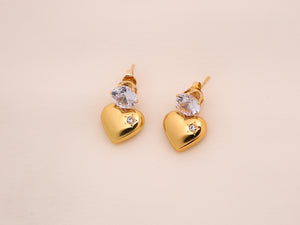 These gold-plated earrings showcase a sleek heart motif paired with a radiant solitaire crystal on top. Minimal yet expressive, they add a warm glow to your look—perfect for day-to-night styling.