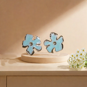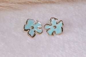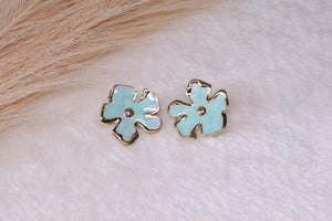 Delicate floral studs in a serene aqua hue, edged with gold and centered with a subtle sparkle for an elegant daytime charm