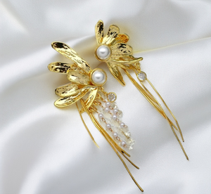 Shimmering gold-plated floral drops with pearl centers and graceful chain details, styled asymmetrically for fresh, modern sophistication.