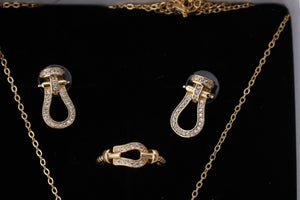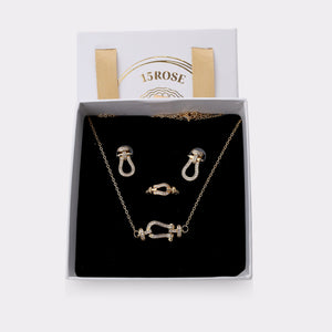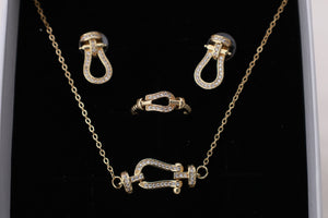 This gold-plated pendant, earrings, and ring set is inspired by iconic lock motifs with a polished, sculptural form. American diamonds trace the contours of each piece, enhancing depth and sophistication.
