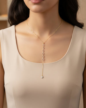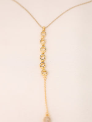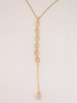Crafted in luminous gold plating, this necklace showcases a series of open-ring circles adorned with finely set American diamonds. Finished with a graceful dangling chain, it offers a sleek, contemporary look that transitions effortlessly from day to evening wear.