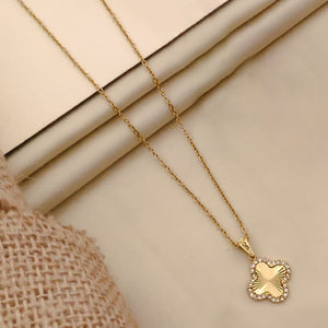 Gold-plated pendant necklace with a radiant clover motif framed by delicate American diamonds, blending everyday charm with graceful luxury.