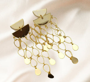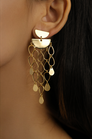 Semi-circular tops paired with flowing gold mesh links for a lightweight statement look.