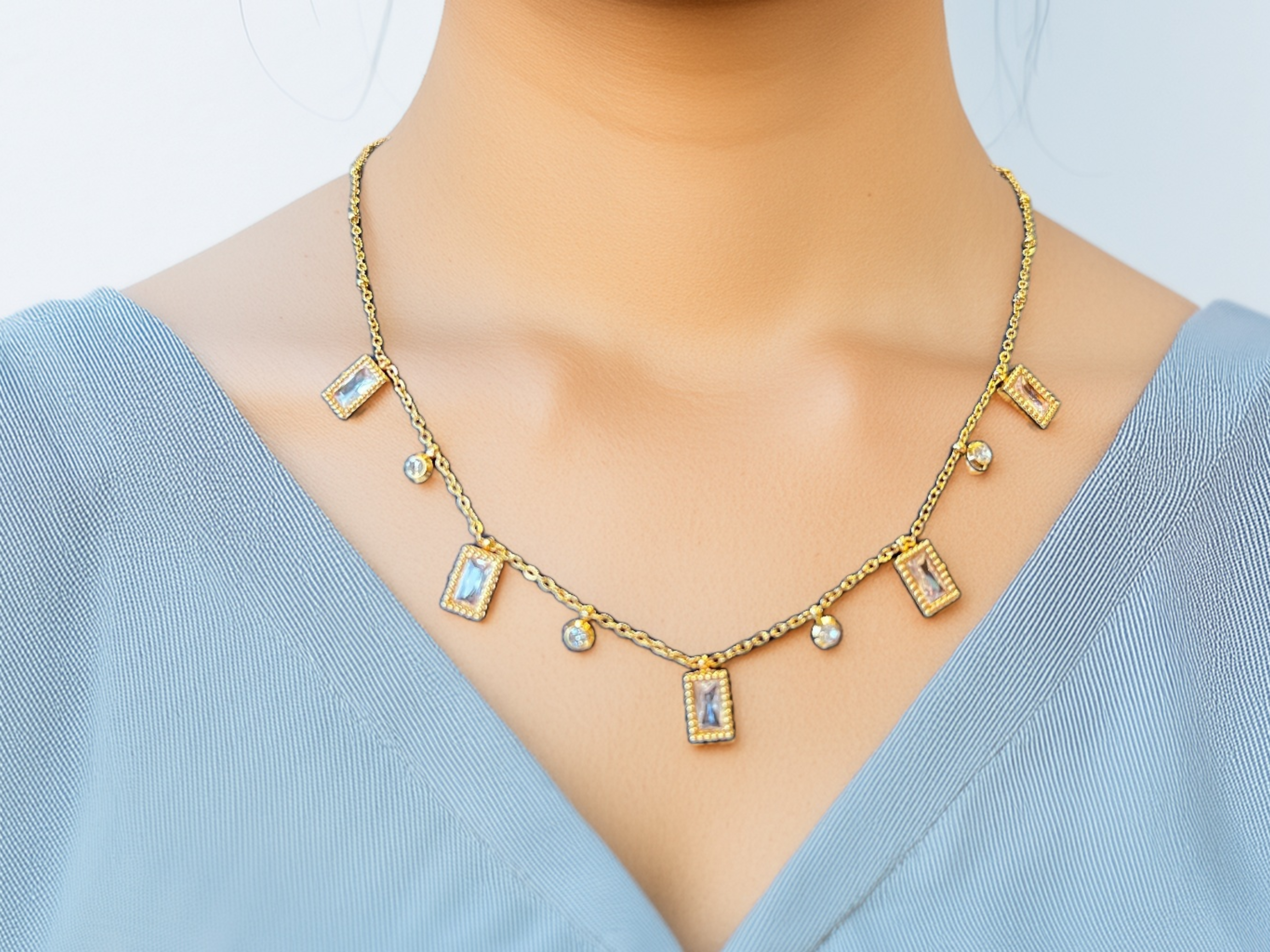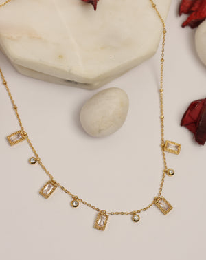 Minimal gold-plated necklace decorated with baguette-style stones and tiny American diamond drops for subtle luxury.