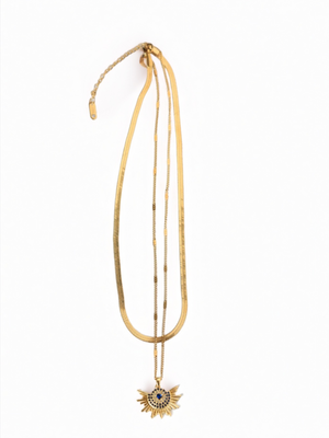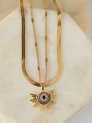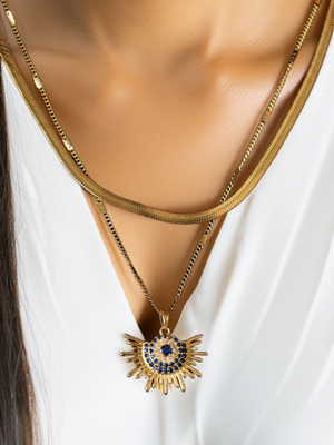 Gold-plated and meticulously crafted, this striking necklace showcases a sun-ray evil-eye pendant studded with blue and American diamonds, embodying both glamour and good fortune.