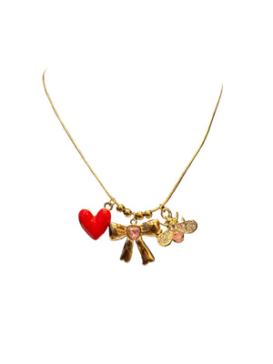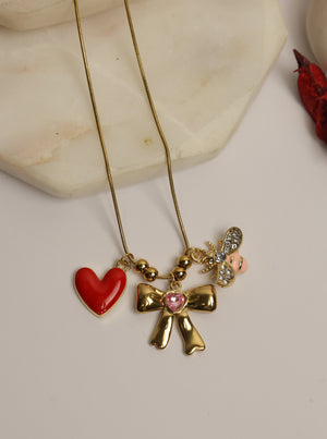 Gold-plated chain with adorable dangling charms: a glossy red heart, a jewelled bow, and a delicate bee motif, symbolising love and sweetness.
