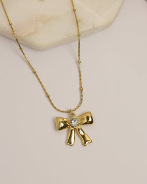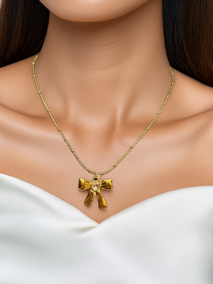 A delicate gold-plated chain paired with a sculpted bow pendant and a stone in the center, perfect for understated elegance.