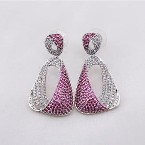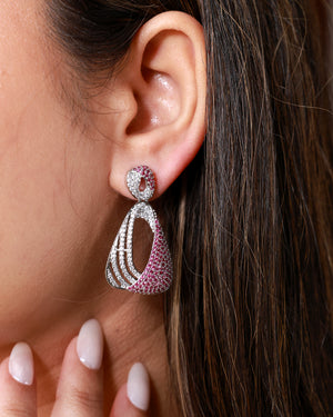Designed in a modern abstract form, these earrings feature a radiant contrast of blush-pink pavé and icy white moissanite stones. The layered curves and high-polish silver finish create a bold statement with a soft, feminine edge.