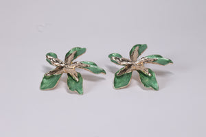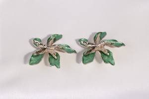 A bold floral statement earring shaped like a five-petal lily, featuring vivid green petals and a gleaming gold-toned center that radiates modern luxury