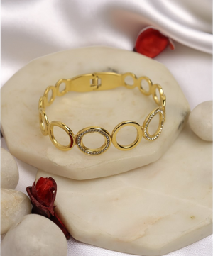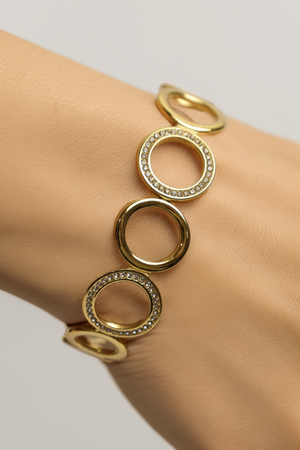 A bold gold-plated bracelet featuring interlinked open circles, half accented with shimmering American diamonds.