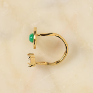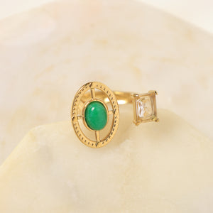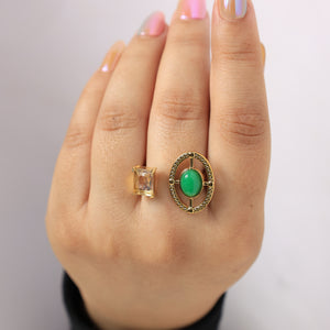 A gold-plated open ring featuring a vibrant green oval stone paired with a sparkling square crystal for a chic dual-tone elegance.