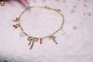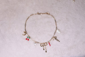 A playful gold-tone chain necklace adorned with eclectic charms including cherries, bows, a dolphin, and a chili pepper—perfect for adding quirky elegance to any outfit.