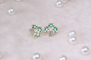 Elegant clover-shaped earrings featuring green enamel, a pearl center, and sparkling stone accents for a charming and lucky touch