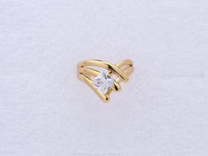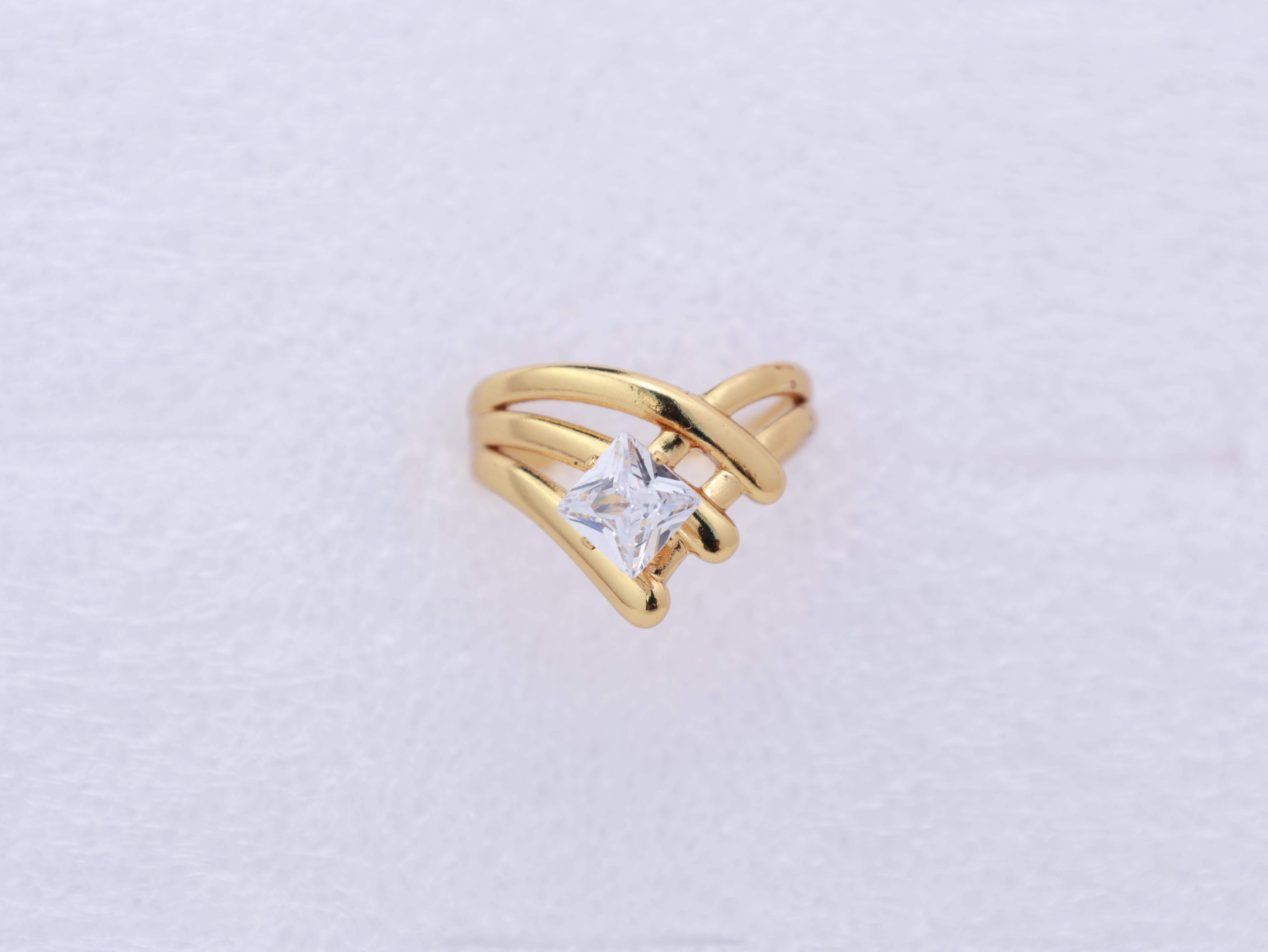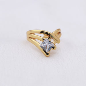 This modern gold-plated design combines stacked curved bands with an open, airy structure. A radiant square zirconia stone highlights the centre for elevated everyday glamour.