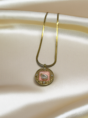 A distinctive necklace with a regal round charm, embellished with pearl accents and pink enamel, evoking timeless prestige.