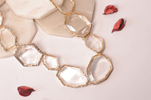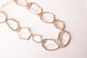 A bold statement necklace and earring set, featuring large, irregularly faceted clear stones set in textured gold frames, exuding contemporary elegance with a luxe, sculptural finish.