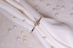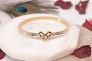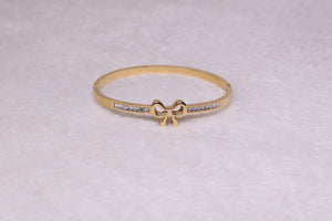 A graceful gold bracelet featuring a charming central bow motif flanked by two rows of square-cut diamonds, adding a delicate touch of elegance.