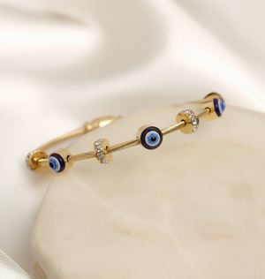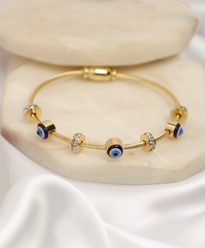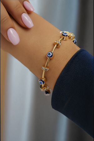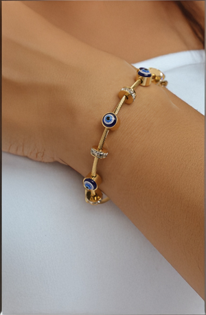 Gold-plated bracelet adorned with protective evil eye motifs and crystal-set spacers, blending mystique with elegance.