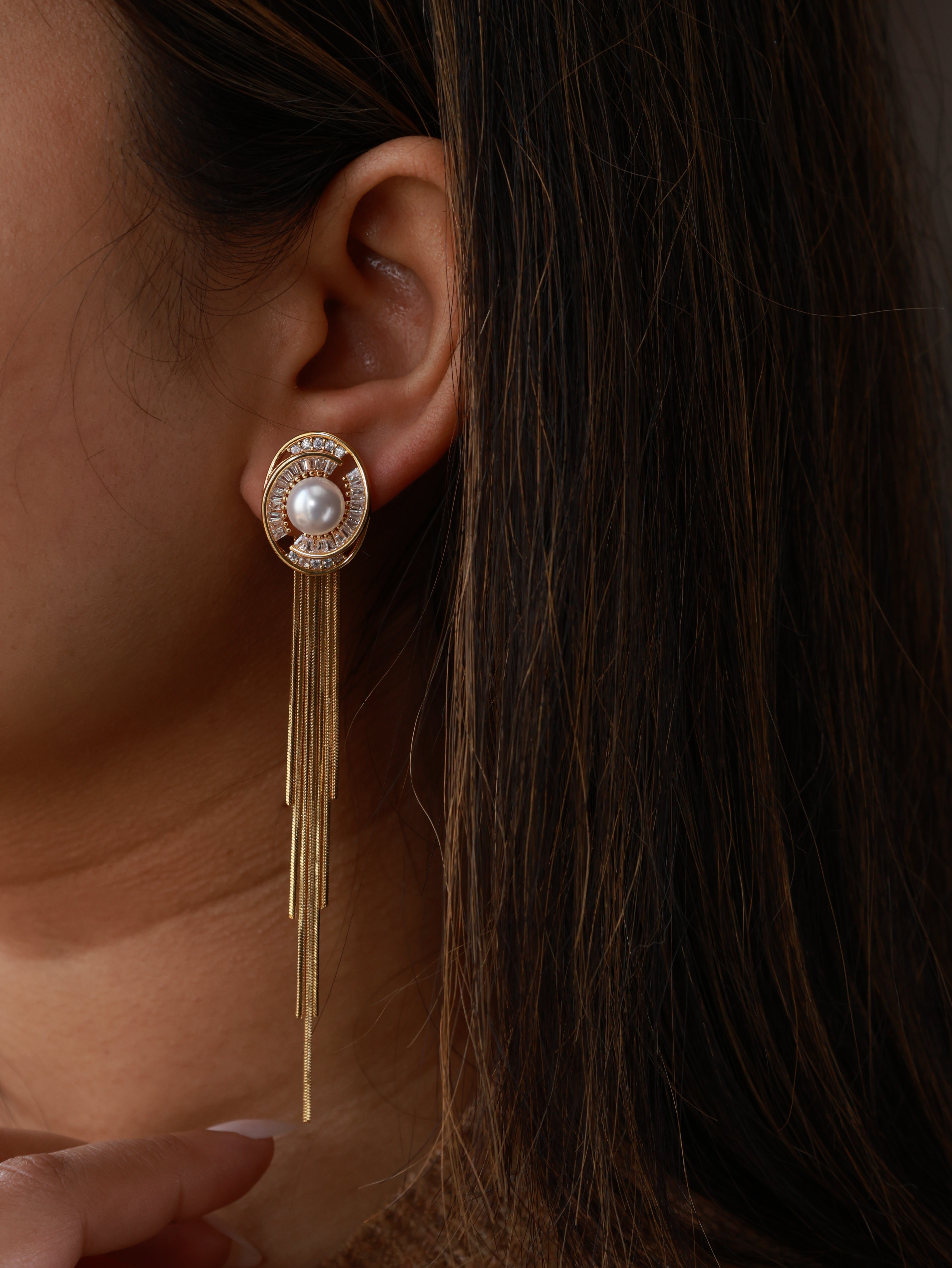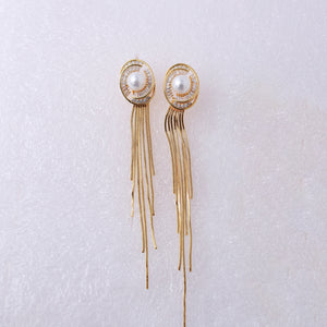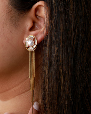 Designed with a polished gold-plated oval stud, these earrings showcase a central pearl embraced by sparkling American Diamond stones. The delicate fringe chains fall smoothly, offering a balance of sophistication and statement.![]()
