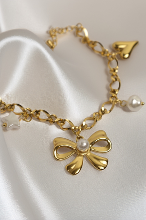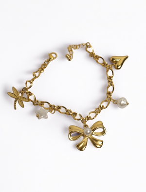 A stylish gold-plated charm bracelet with a mix of motifs—bow with pearl, heart, star, and dragonfly—for a whimsical, feminine touch.