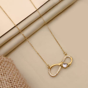 A graceful gold-plated chain featuring an infinity pendant elegantly studded with shimmering American diamonds and a delicate heart centrepiece — a radiant symbol of everlasting affection.