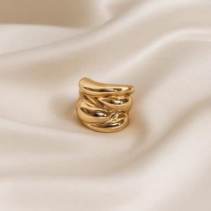 A wide gold band with layered folds, blending modern design with smooth, natural curves for an elegant finish.