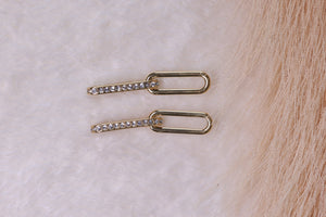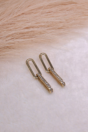 Sleek gold oval-link earrings with a vertical bar encrusted in shimmering crystals, offering a modern, minimalist glam look.
