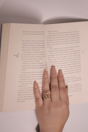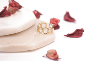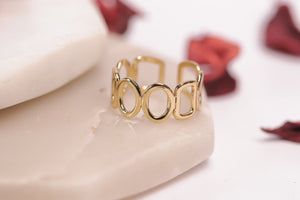 A sleek, modern ring featuring interlinked gold geometric shapes that blend with symmetry