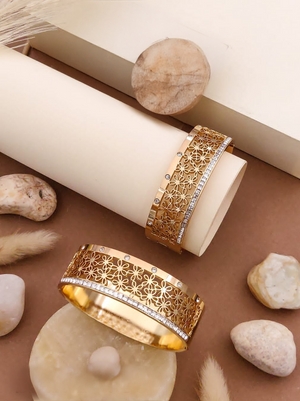 An elegant gold-plated bangle bracelet with detailed floral filigree bordered by American diamonds, radiating modern charm with a traditional touch.