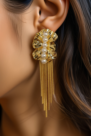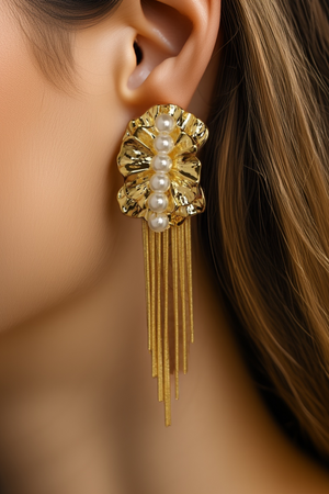 Gold-plated statement earrings showcasing a ruffled floral design lined with pearls and finished with tasseled chains.