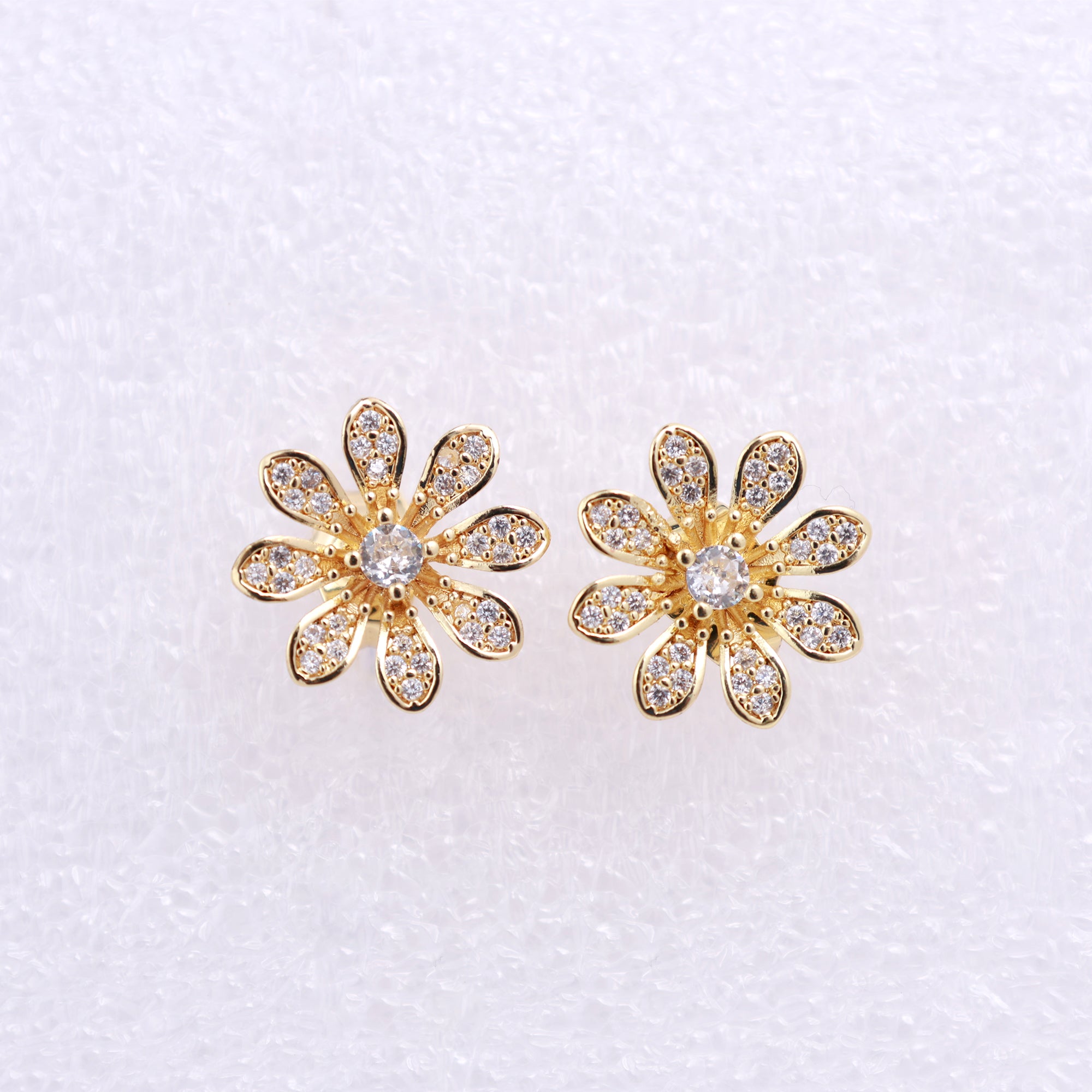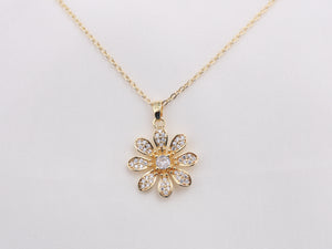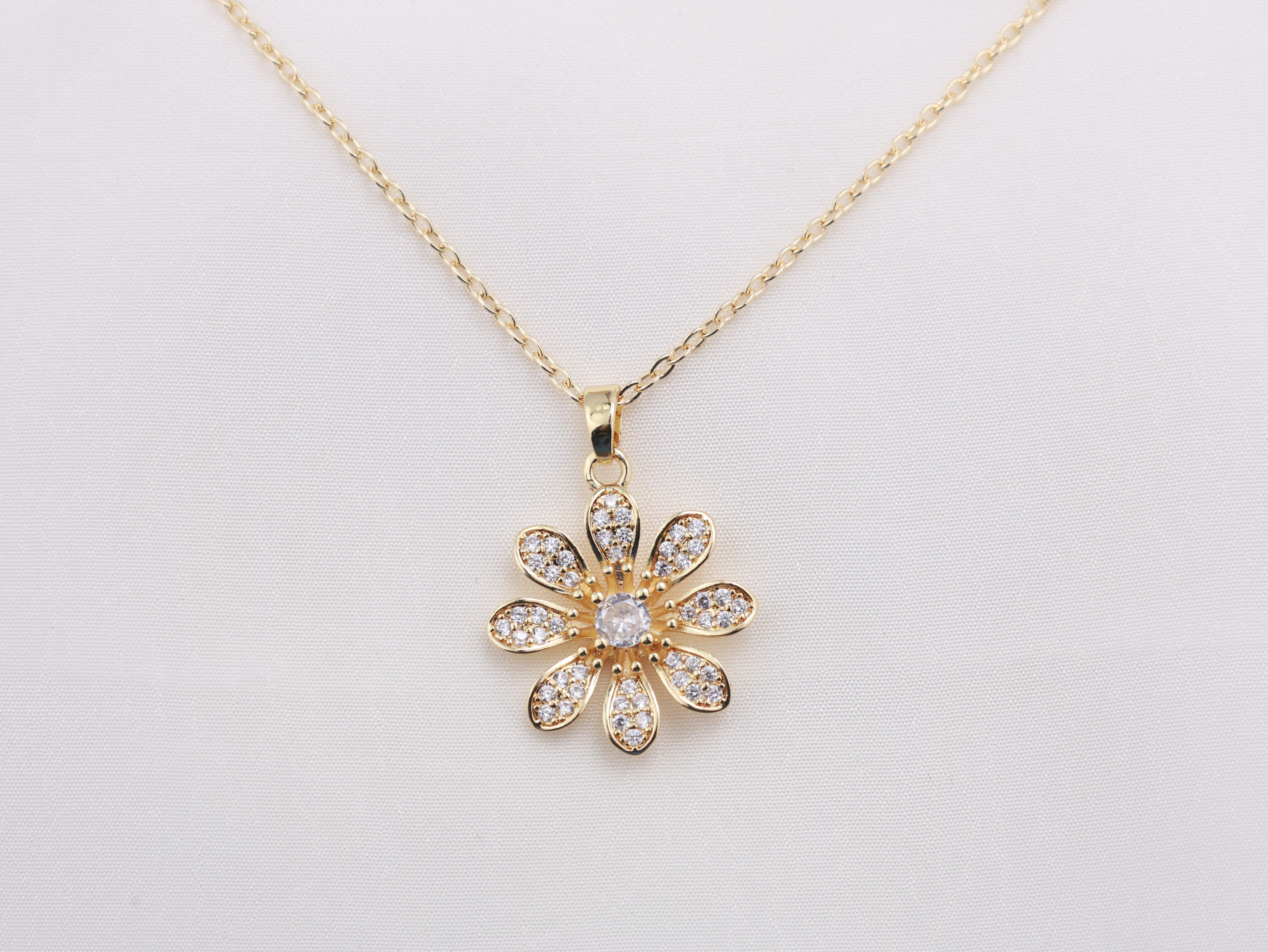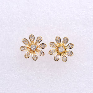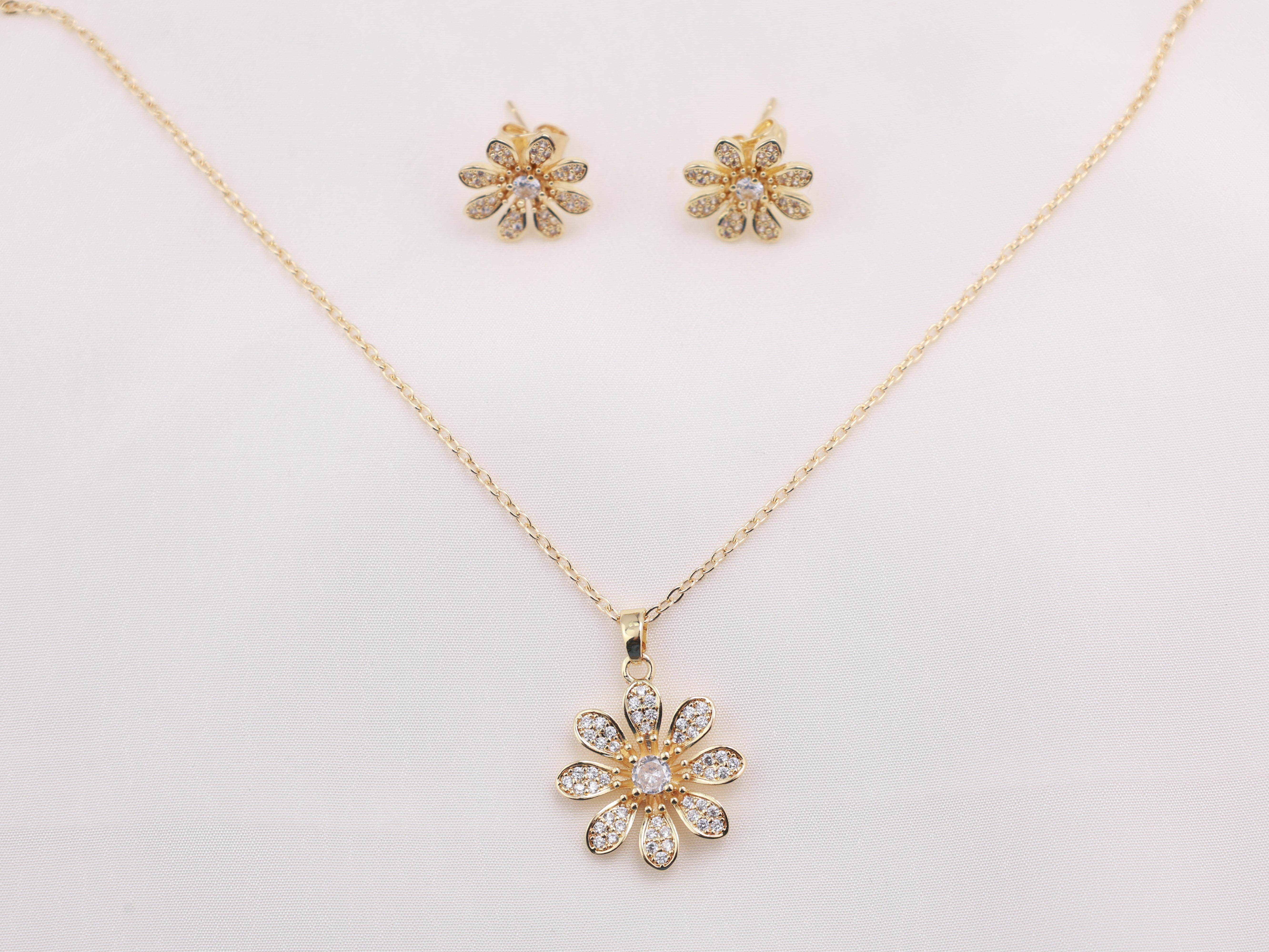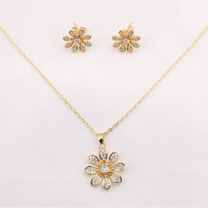 A delicate gold-plated earring and pendant set crafted in a charming daisy silhouette with softly rounded petals. Each petal is encrusted with shimmering American diamonds, framing a brilliant central stone. A timeless floral design that adds graceful sparkle to everyday and occasion looks.