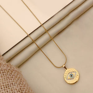 This gold-plated necklace showcases a round pendant with a shimmering evil-eye design studded with American diamonds, offering a blend of grace and symbolism.