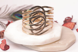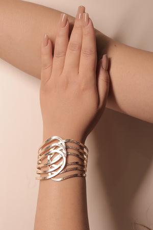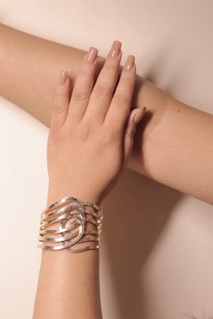 This bold statement bracelet features layered, textured gold bands that swirl into a rippling centerpiece—evoking fluid motion and artistic elegance