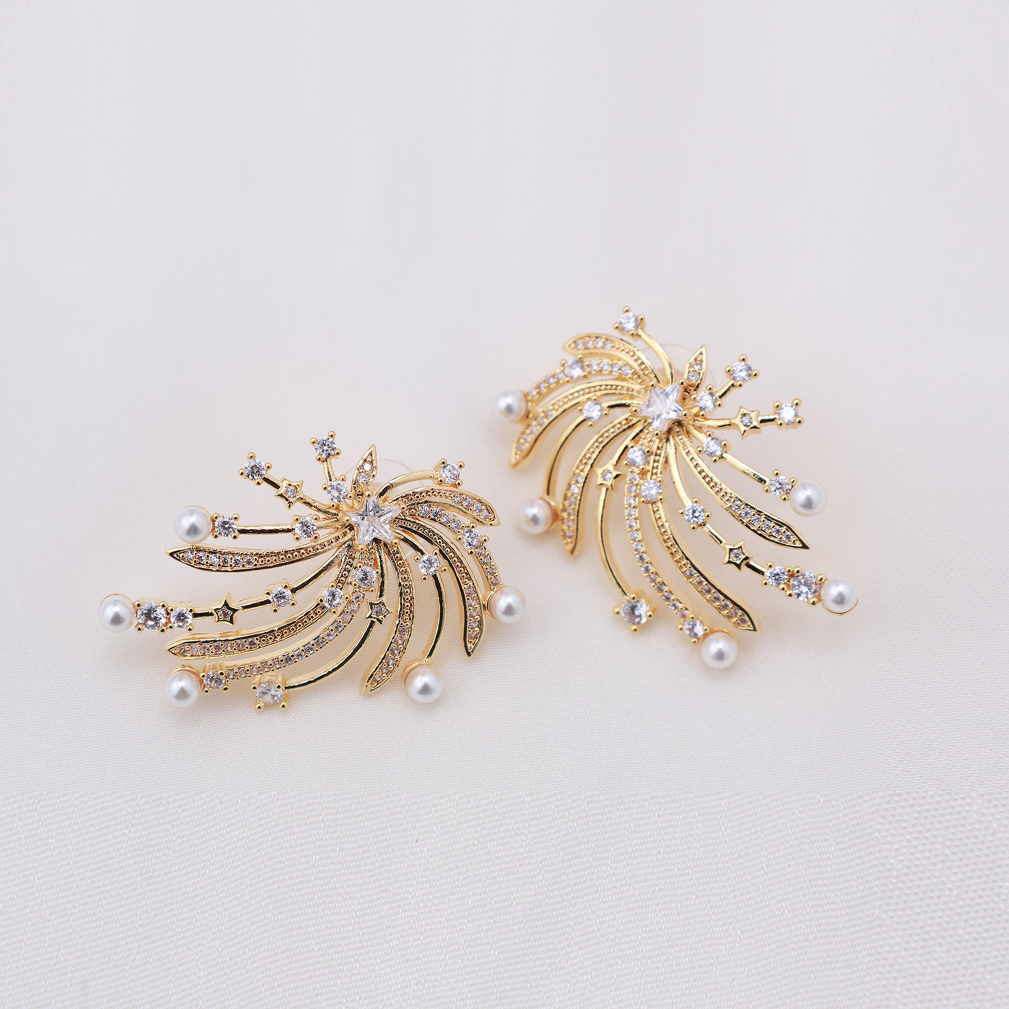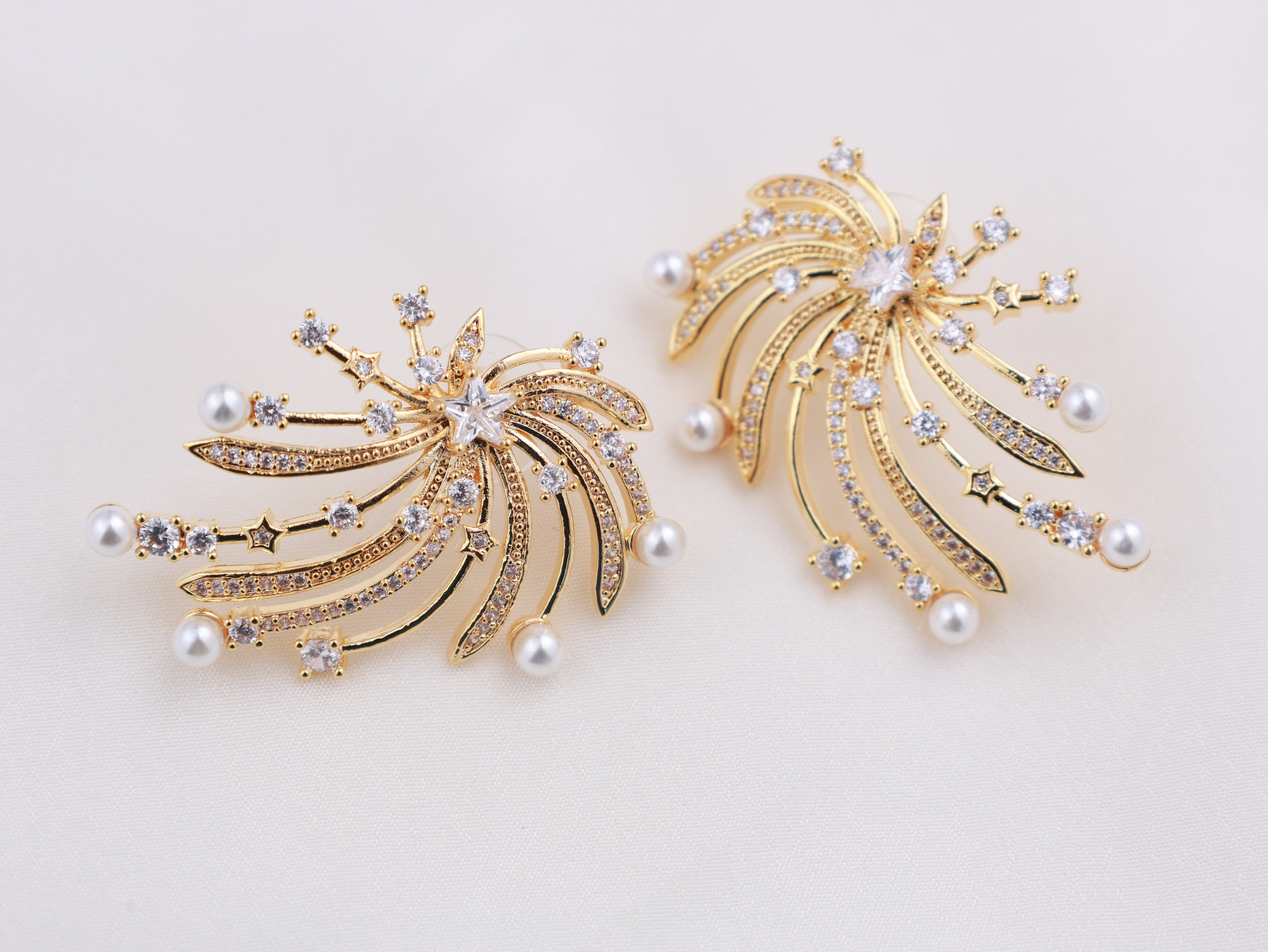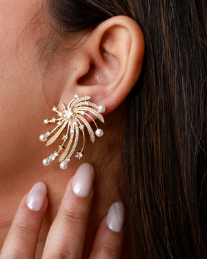 These gold-toned earrings feature a radiant, starburst-inspired design adorned with shimmering American diamond stones. Soft pearl accents add elegance to the flowing silhouette, creating graceful movement with every turn. Perfect for festive evenings and statement occasions.