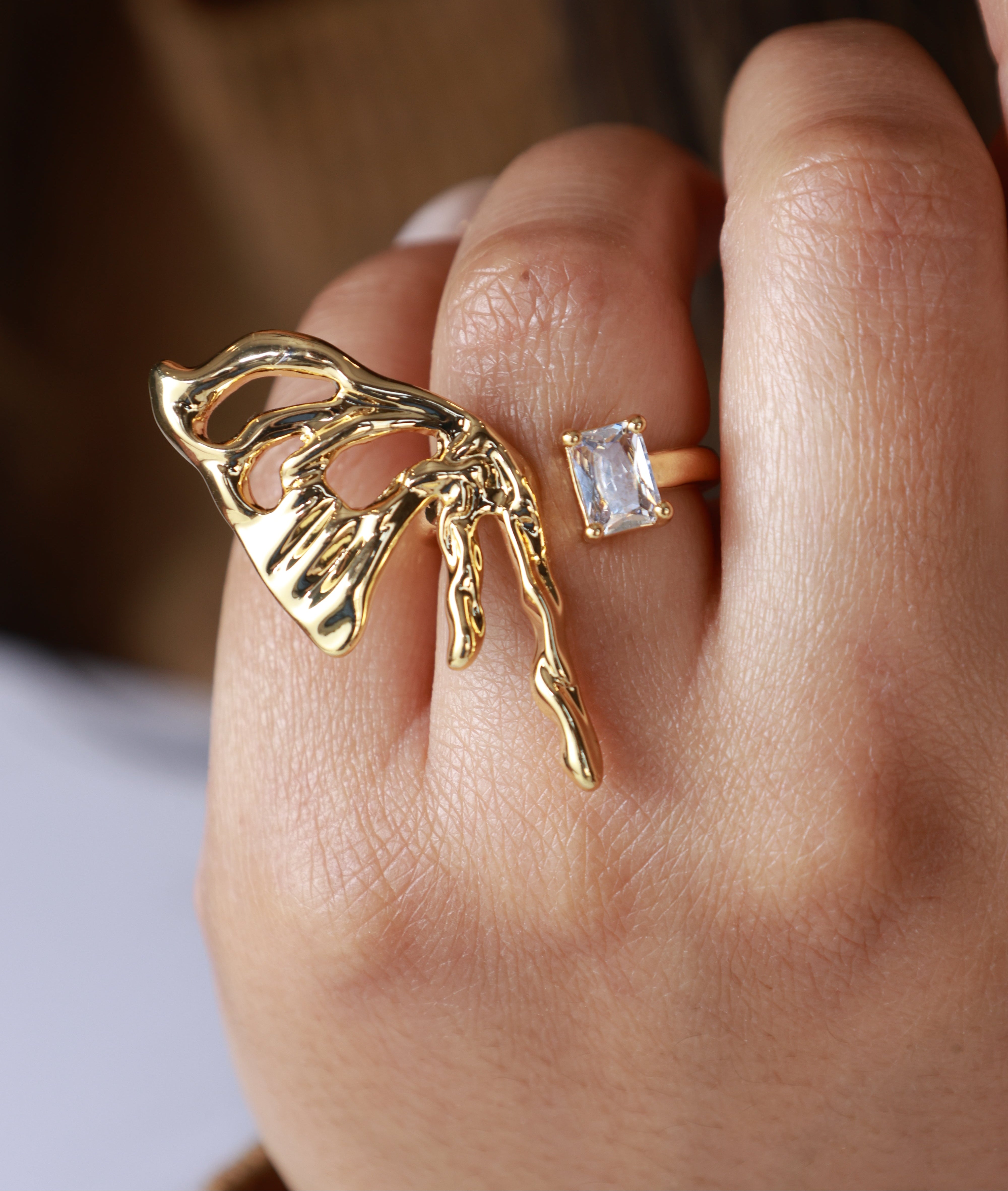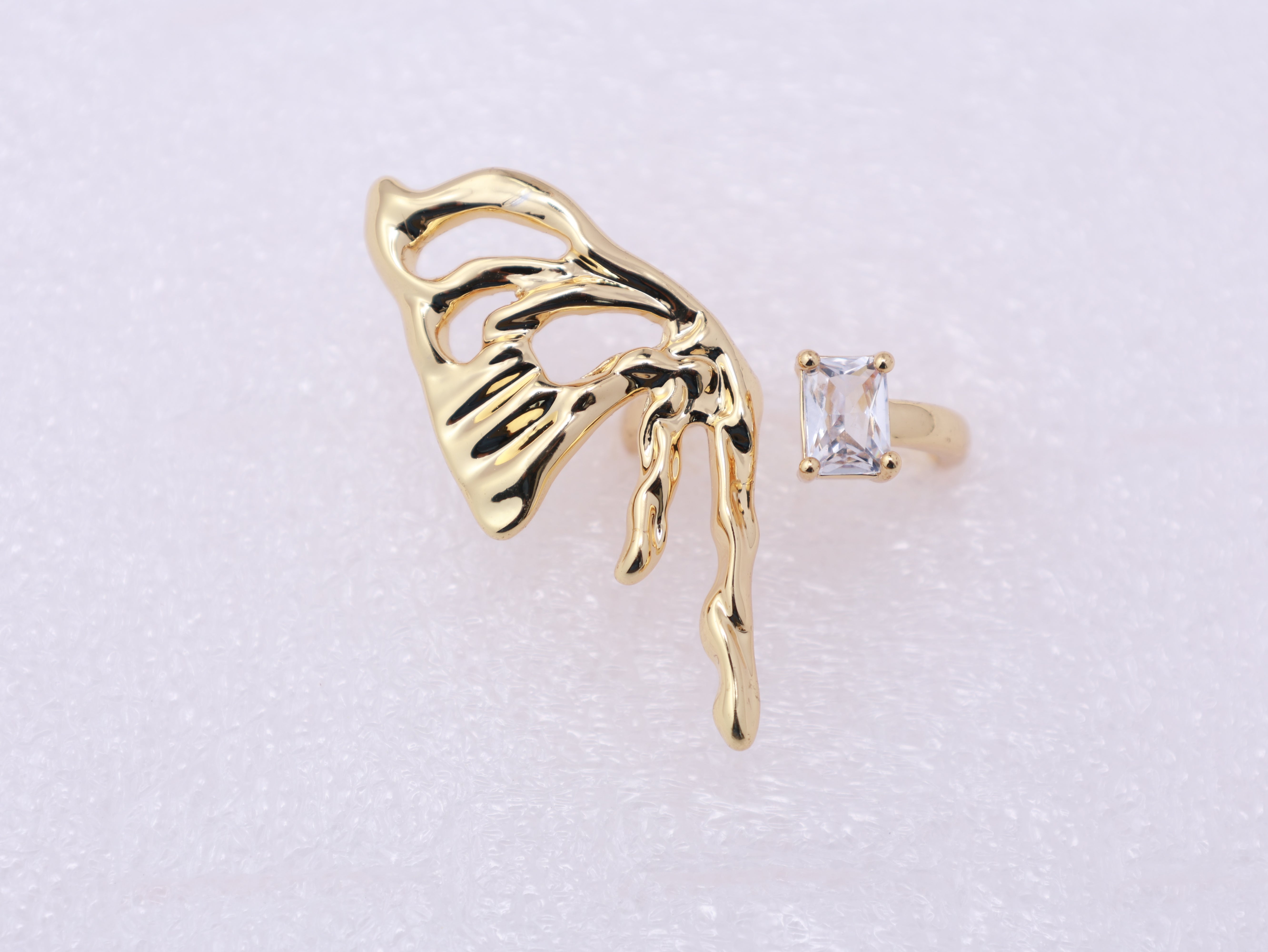 A gold-plated open ring shaped like a delicate butterfly wing with flowing cut-out curves. Finished with a clear baguette-cut clear stone that adds sparkle and modern contrast.![]()