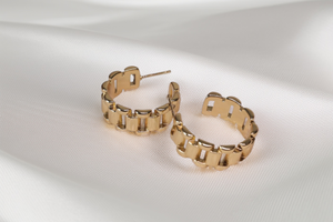 These half-hoop earrings feature a bold interlinked design in polished gold, echoing the style of a classic watch strap for a chic, structured look