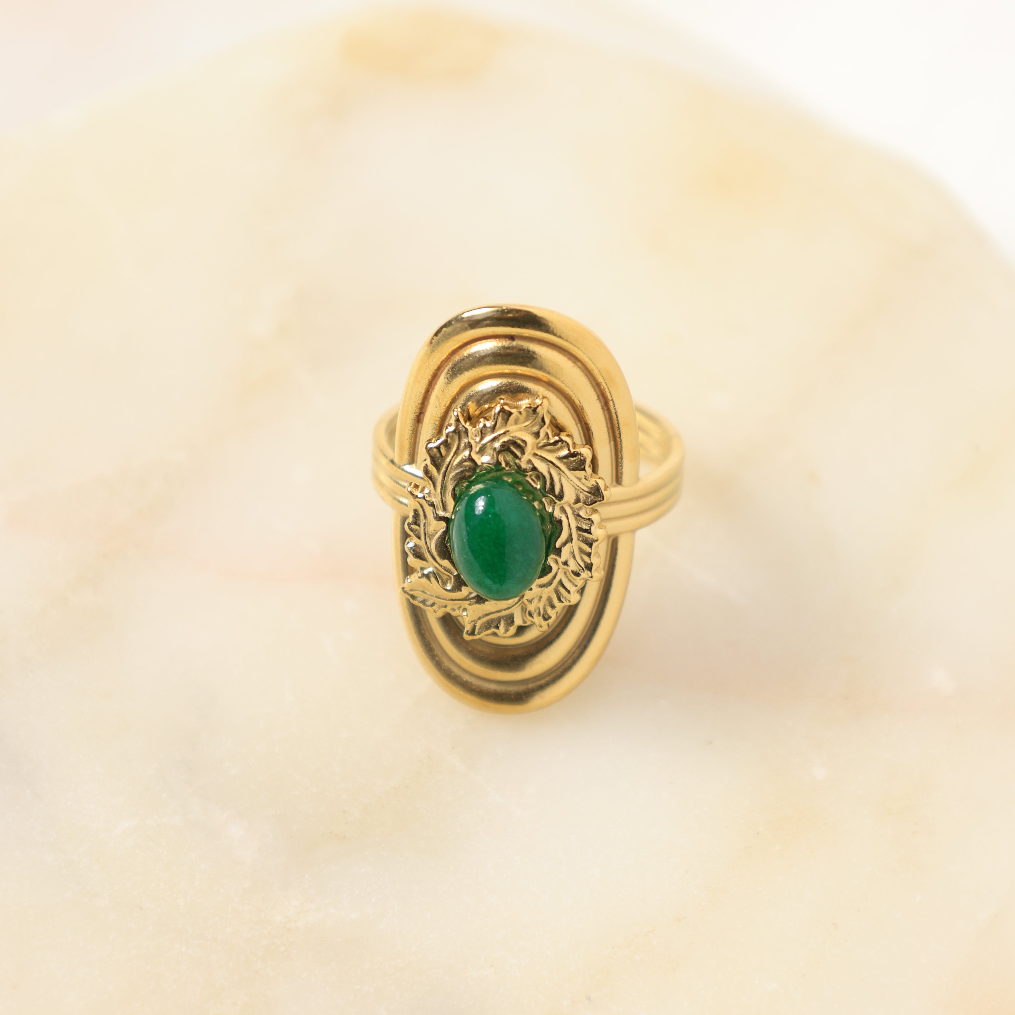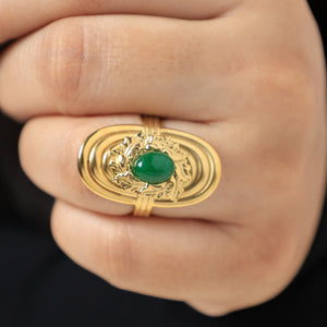A luxurious gold-plated statement piece with a verdant green cabochon framed by intricate antique-style detailing.