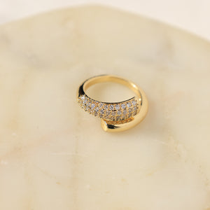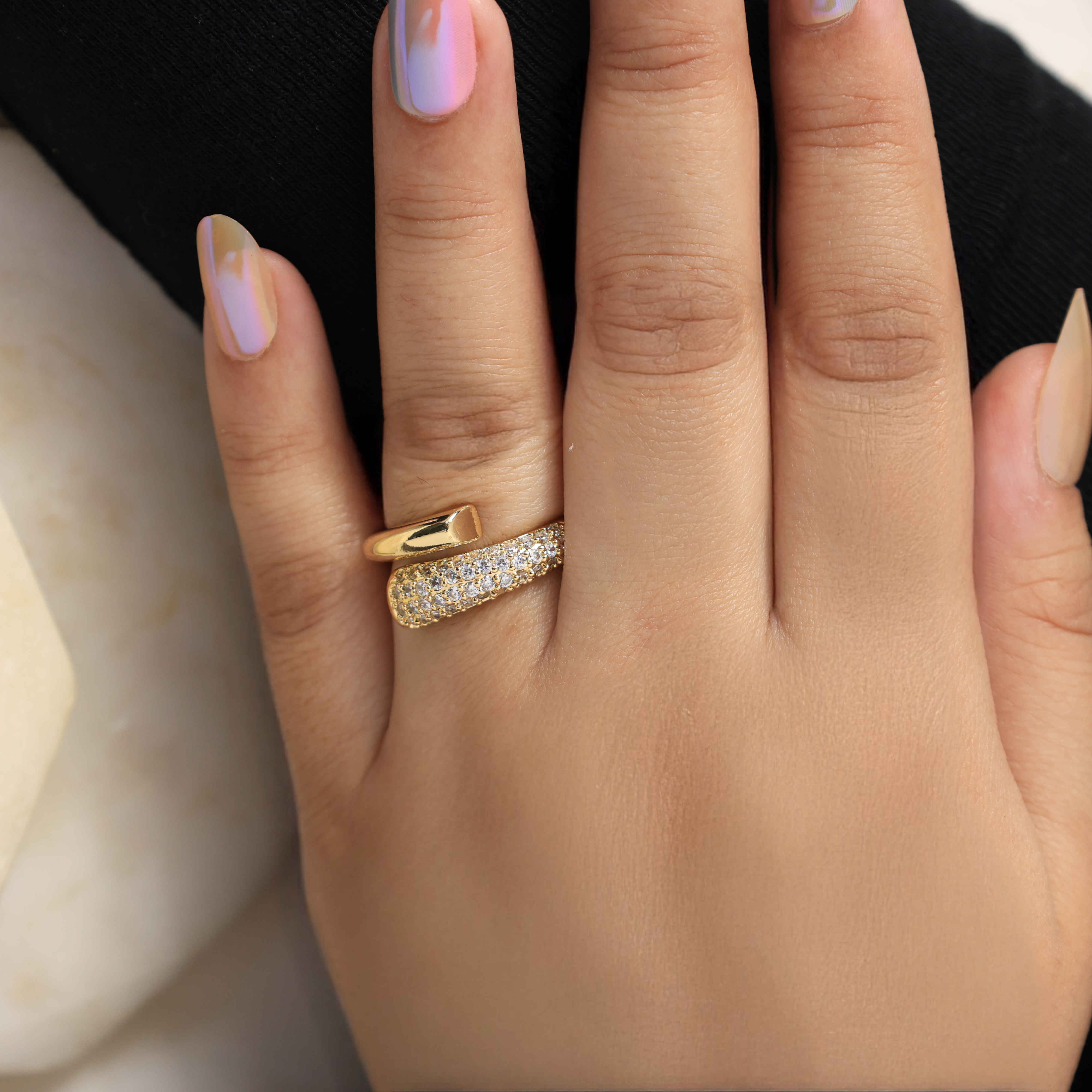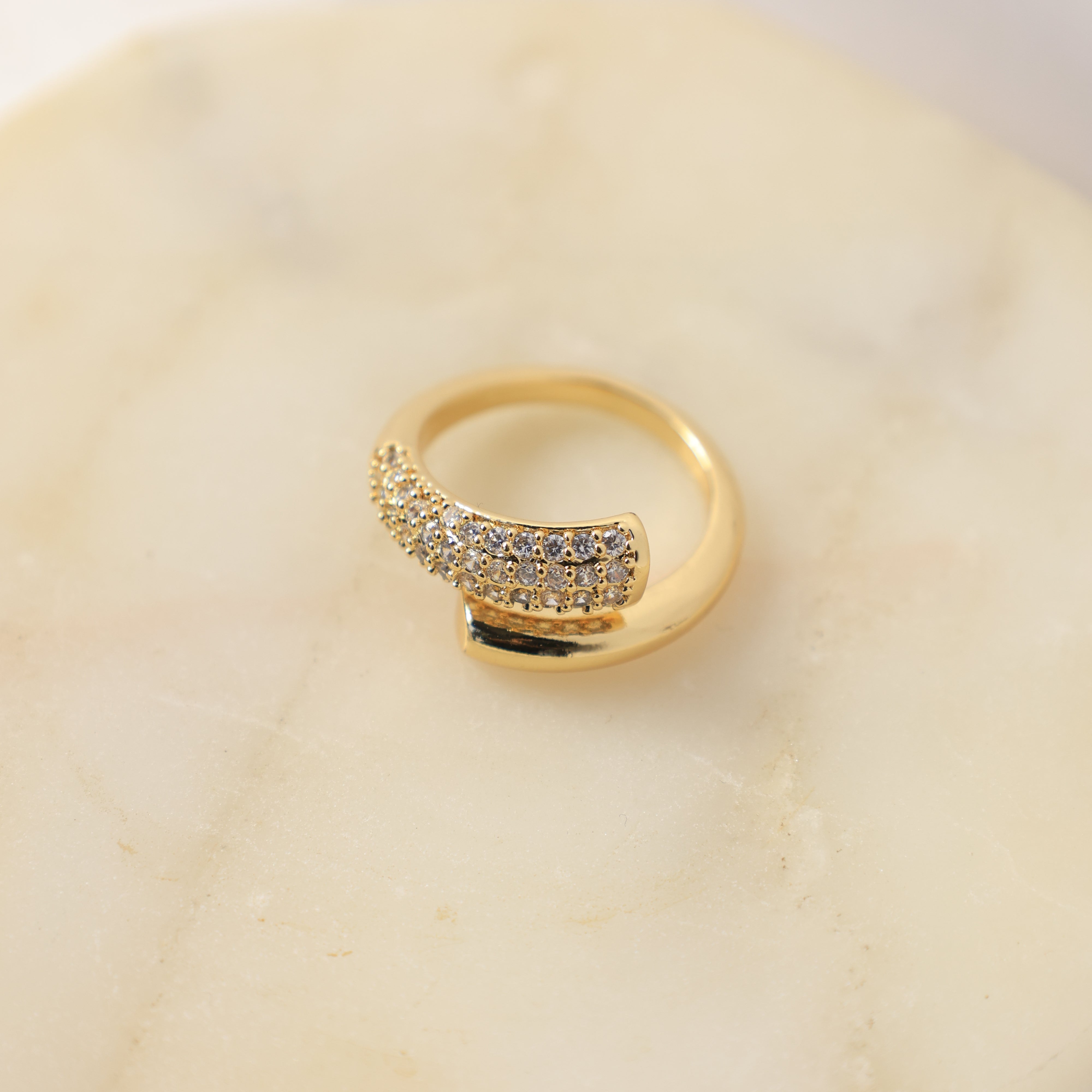 A contemporary crescent-shaped ring with gold plating and pavé-set American diamonds for effortless elegance.