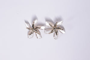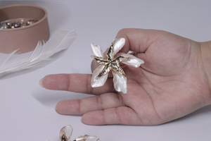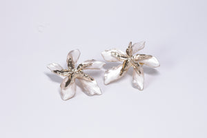 A bold floral statement earring shaped like a five-petal lily, featuring soft pearlescent petals and a gleaming gold-toned center that radiates modern luxury