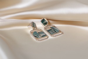 Modern rectangular drop earrings featuring rich green marbled panels framed in gold, blending nature-inspired tones with architectural design