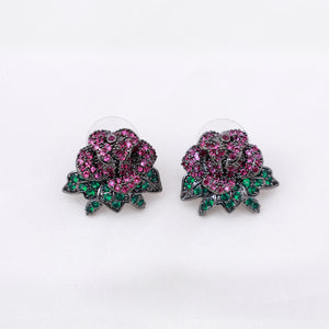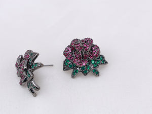 These statement studs are crafted in a polished silver finish and designed in the form of a fully bloomed rose. The petals are set with blush-pink moissanite stones, arranged closely to create a rich, layered floral effect. Deep green moissanite accents at the base resemble delicate leaves, adding contrast and dimension. The sculpted silhouette and high-brilliance stones make these earrings a striking choice for festive evenings and special occasions.
