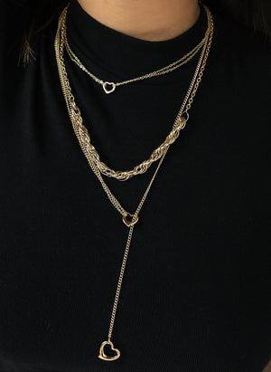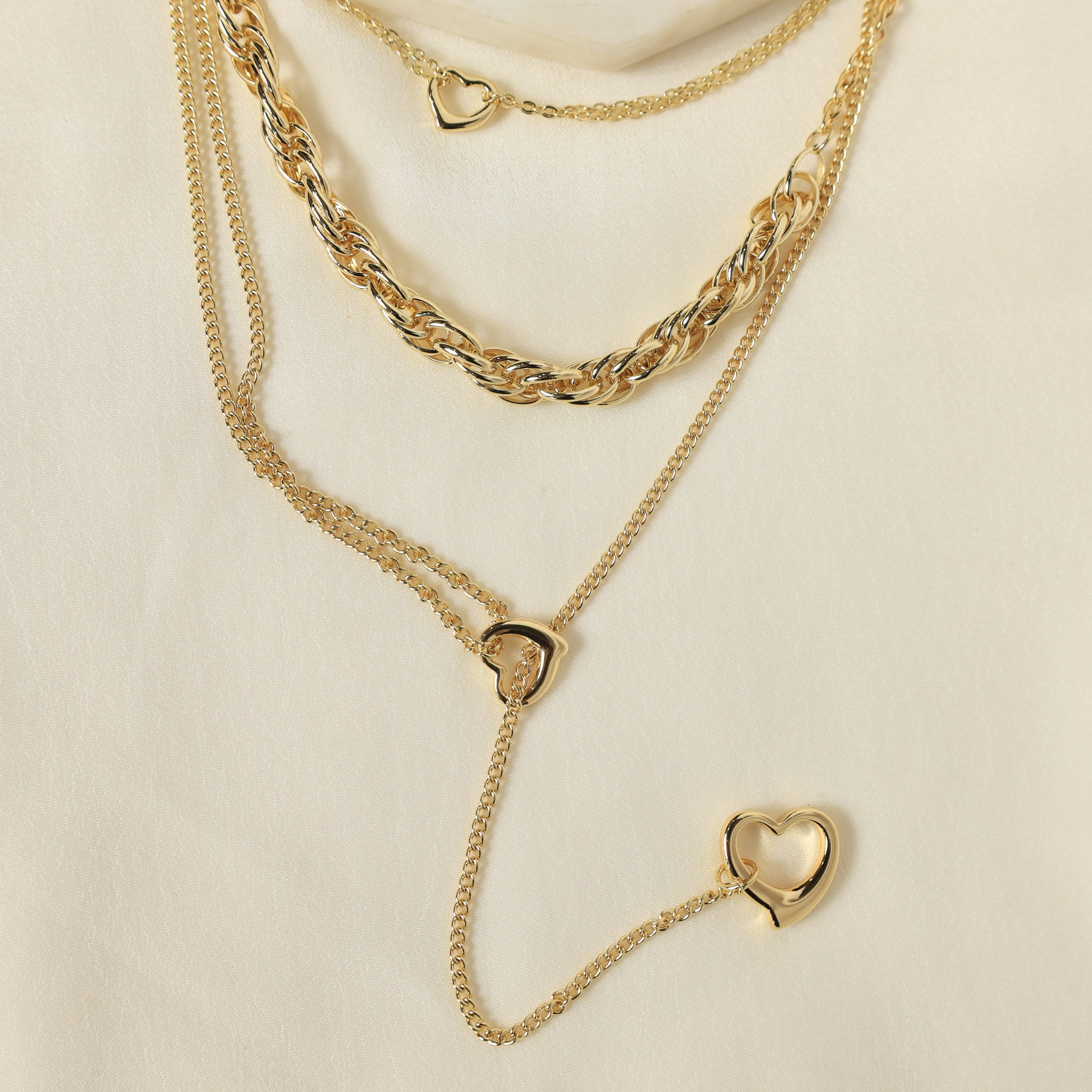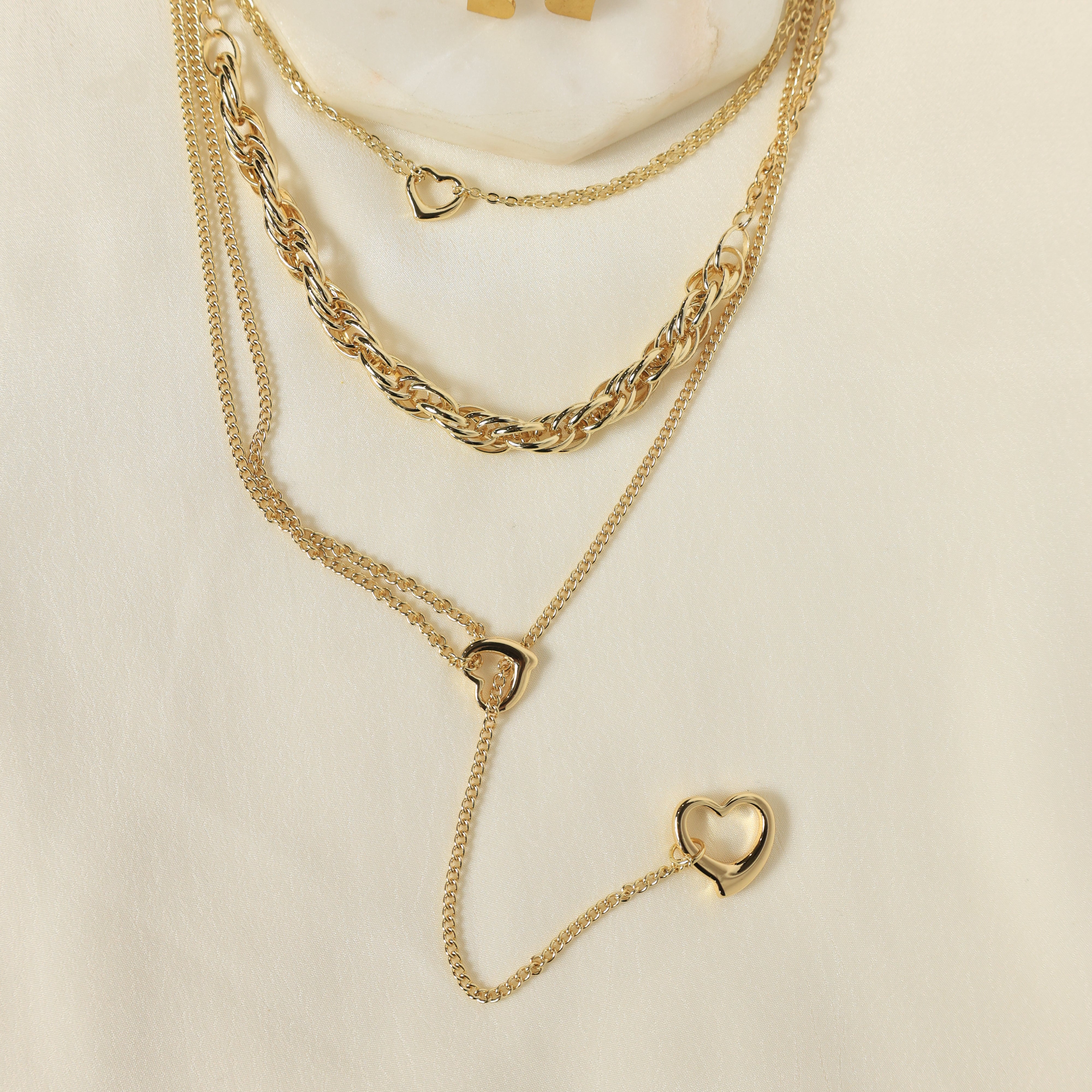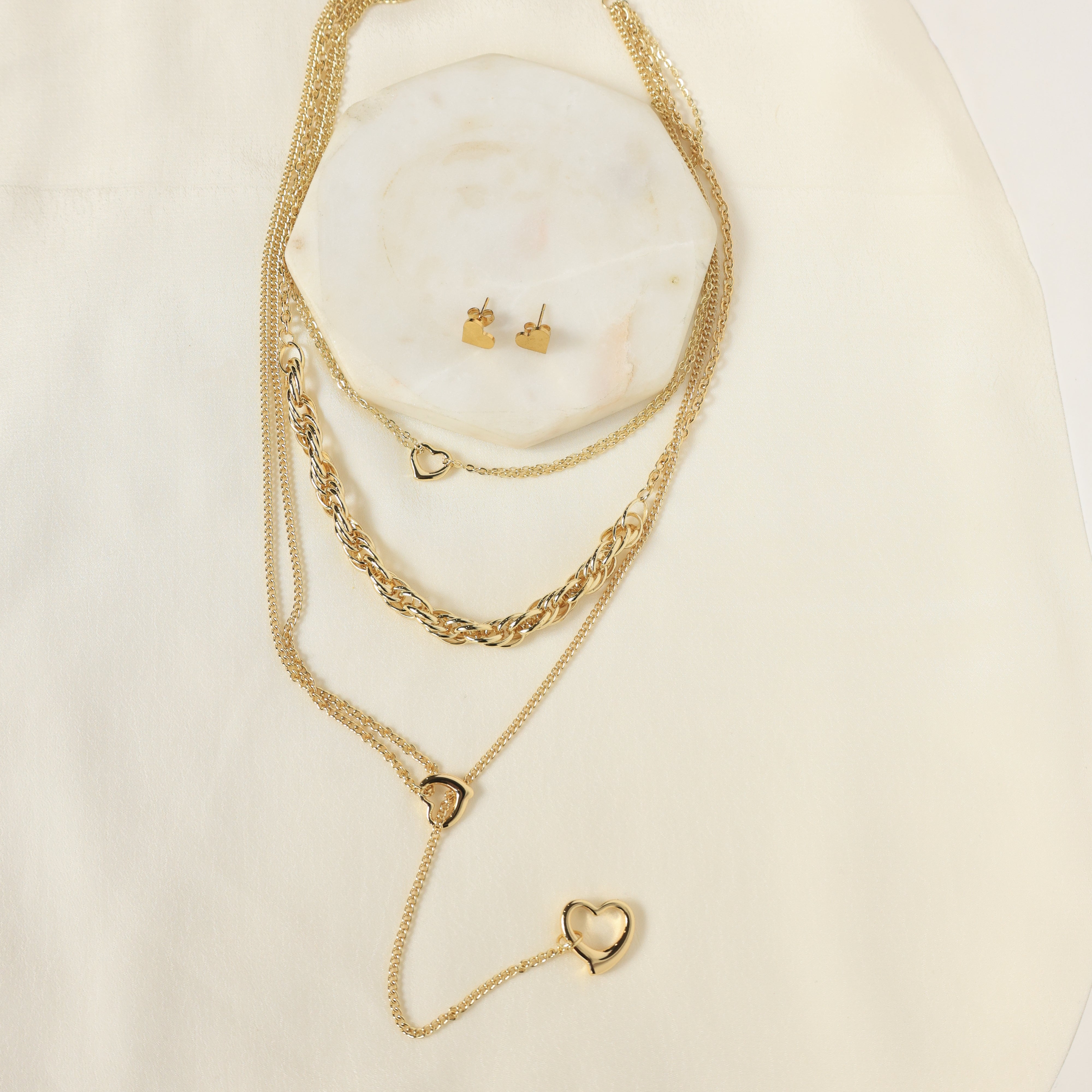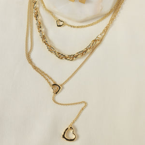 A romantic gold-plated ensemble with open-heart charms and sleek layered chains, complemented by dainty heart earrings for a look of modern sophistication.