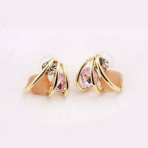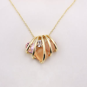 A sculptural gold-plated earring and pendant set featuring soft blush-toned accents wrapped in fluid, ribbon-like curves. Brilliant moissanite stones sit at the centre, adding crisp sparkle against the warm, polished gold finish.