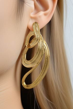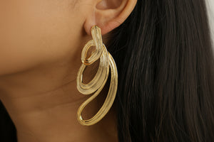 Statement earrings featuring ribbon-like gold swirls, intricately layered to form an open teardrop silhouette with a fluid and elegant finish.