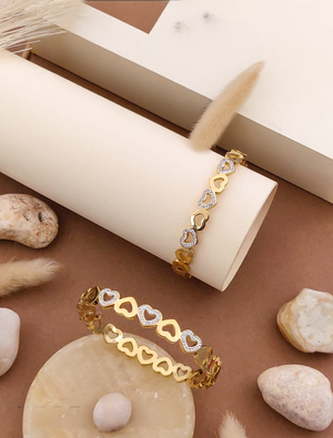 A charming gold-plated bangle styled bracelet featuring interlinked heart motifs, accentuated with shimmering American diamonds — a perfect symbol of timeless love and elegance.