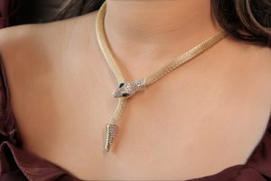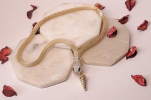 A sinuous gold mesh flexible chain with magnetic lock, gem-studded snake head and tail, evoking bold mystique and luxury.