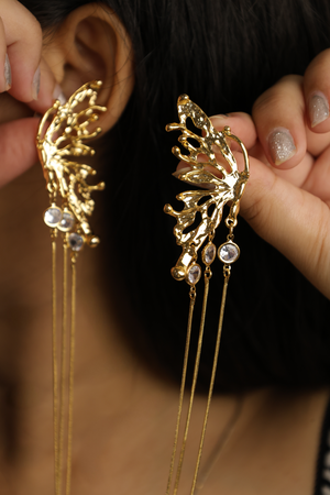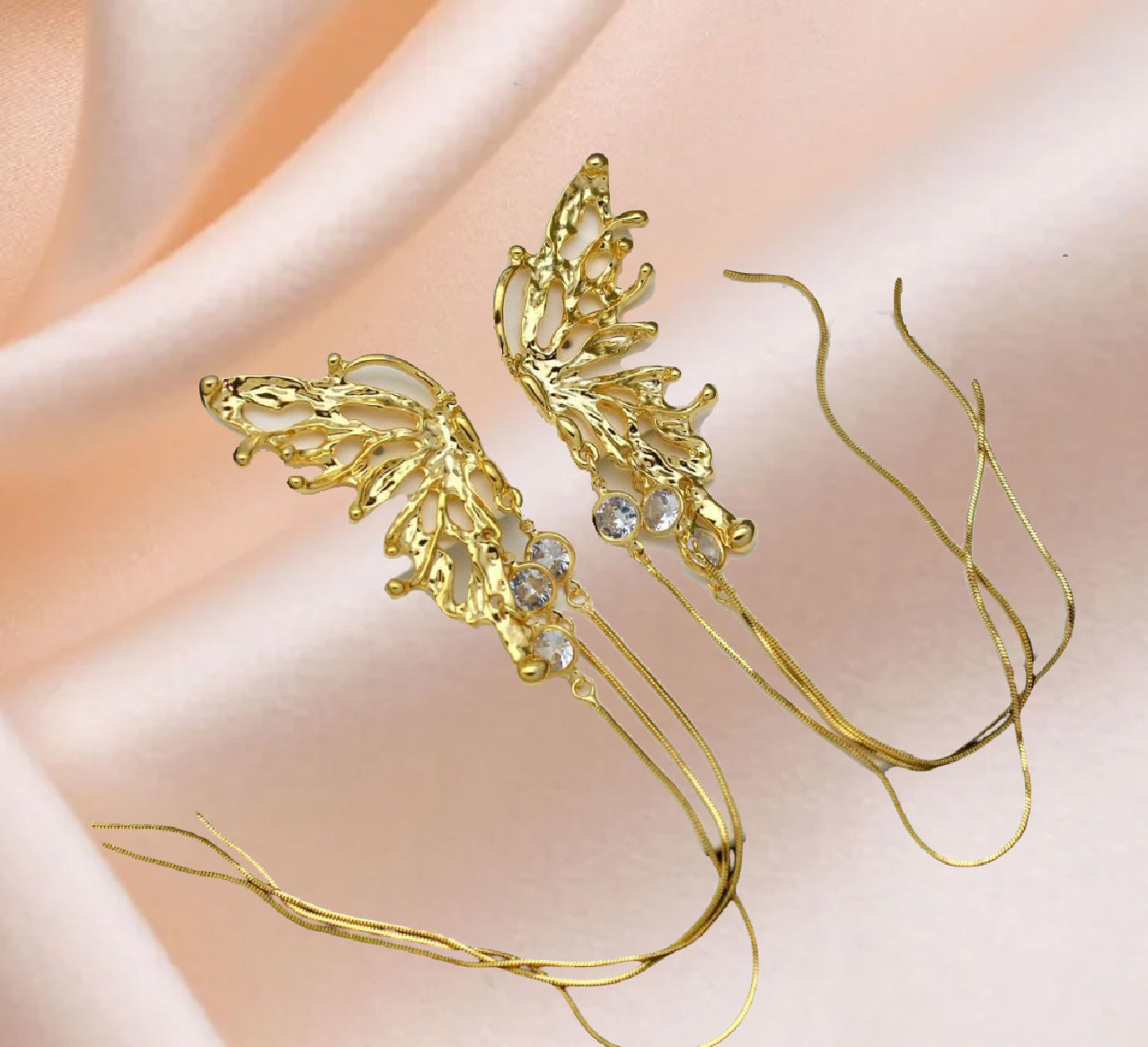 Shimmering wing-shaped studs in gold, highlighted with clear stones and delicate chain drapes.