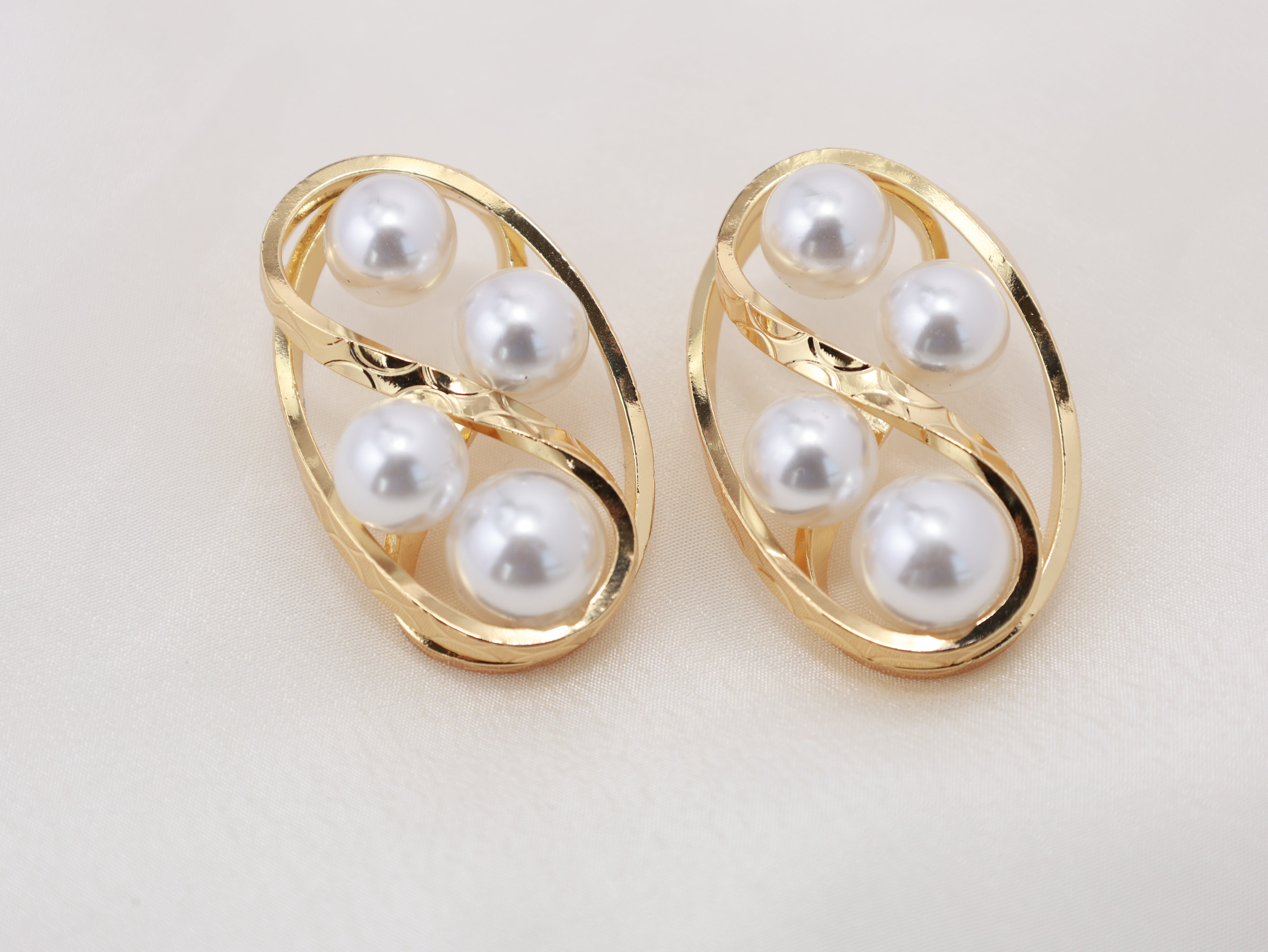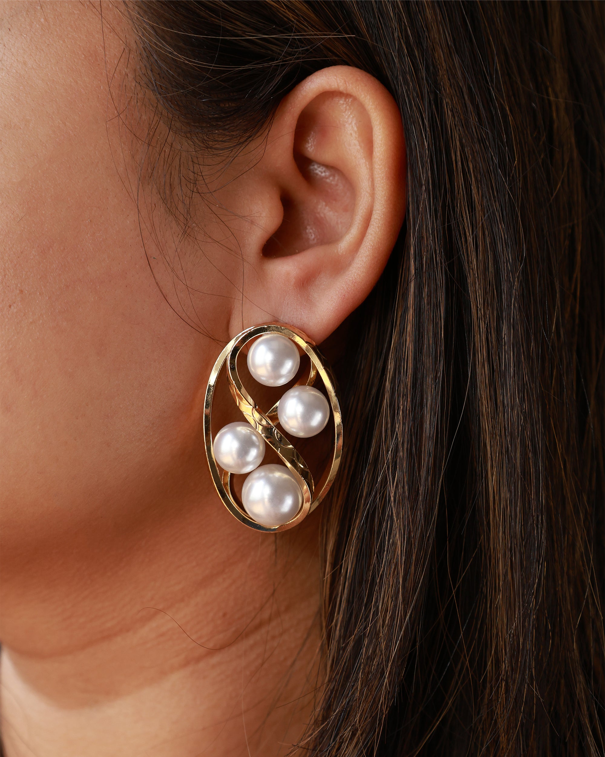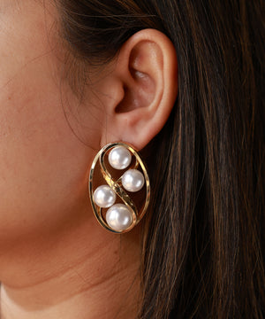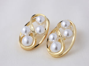 These gold plated stud earrings feature an intertwined oval design adorned with smooth pearl highlights. The dimensional structure gives a bold yet elegant statement, perfect for elevated styling.![]()