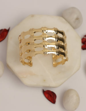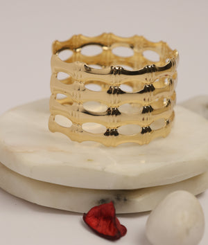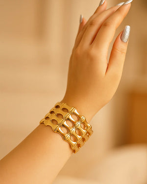 This gold plated cuff bracelet features a lattice-inspired openwork design, balancing strength with refined elegance.